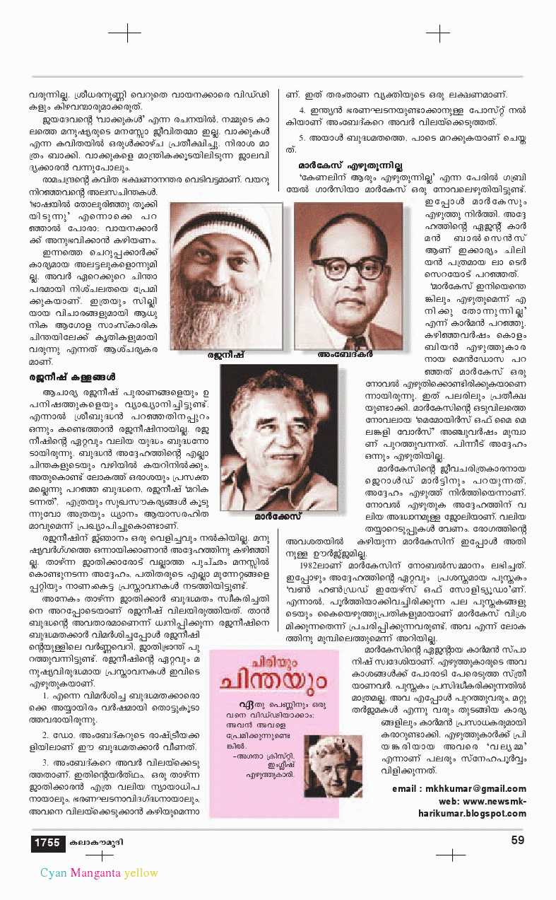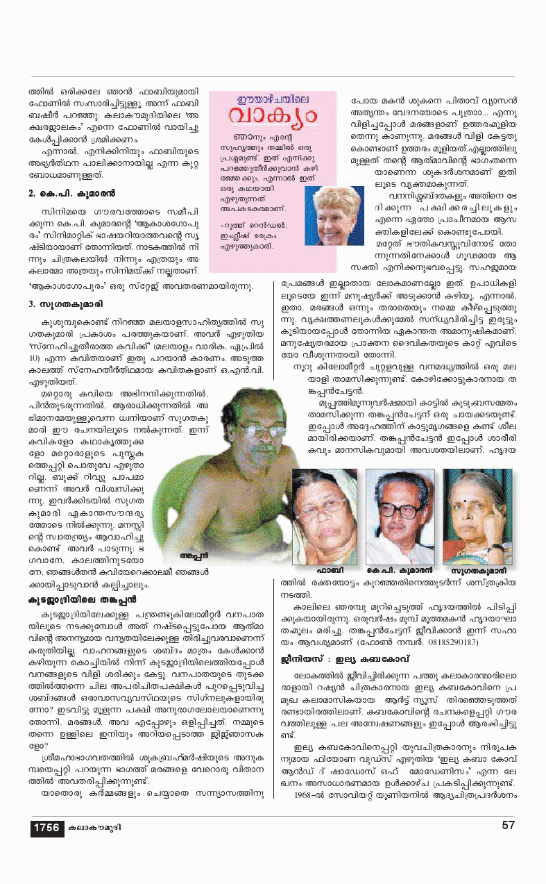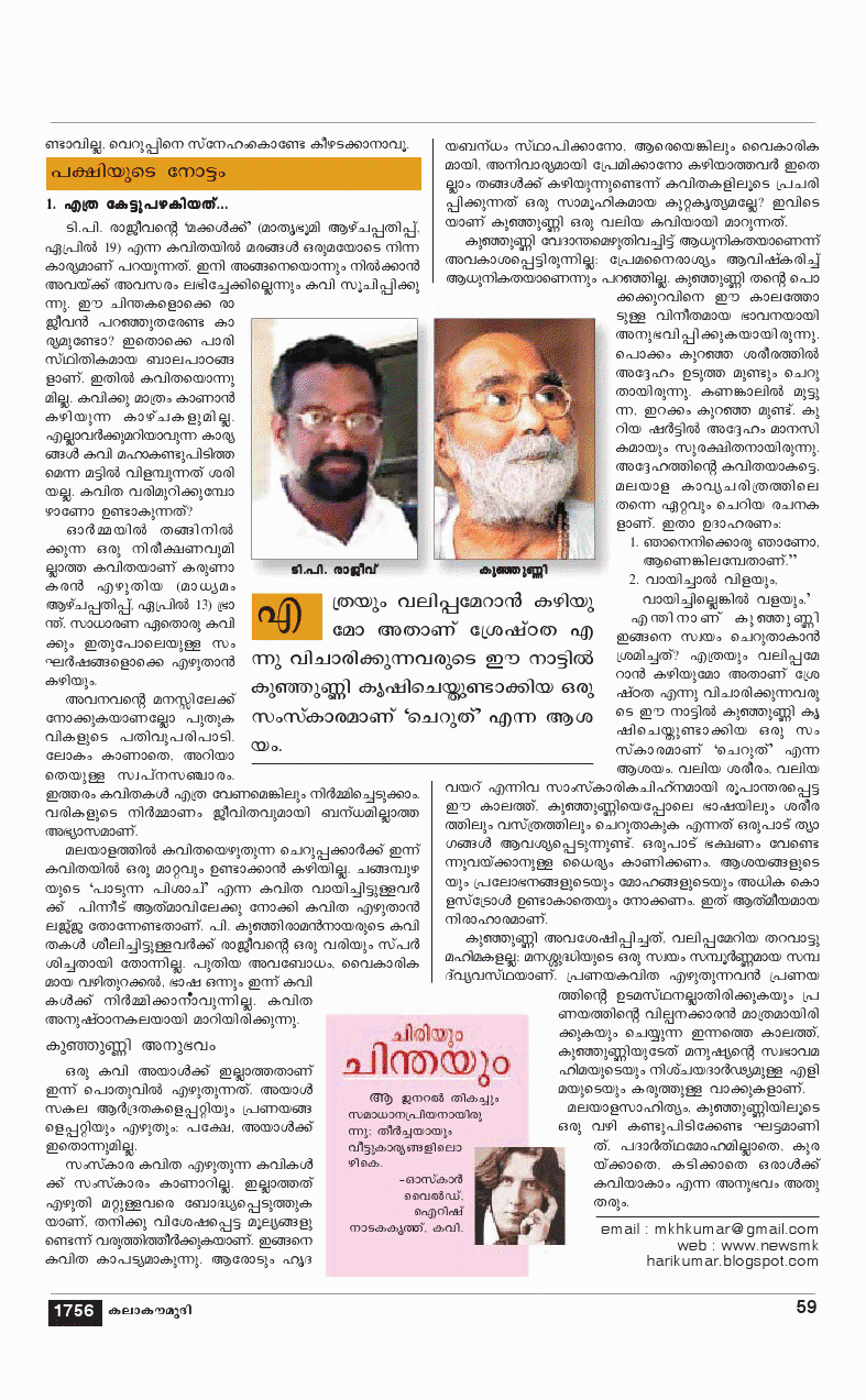 His regular column “Aksharajaalakam” in Kerala Kaumudi and Kalakaumudi soon became very popular. This earned him the widest spectrum of readers on account of its sharpness, punch and gravity. This column also helped him to be recognized as a serious critic in Malayalam literature