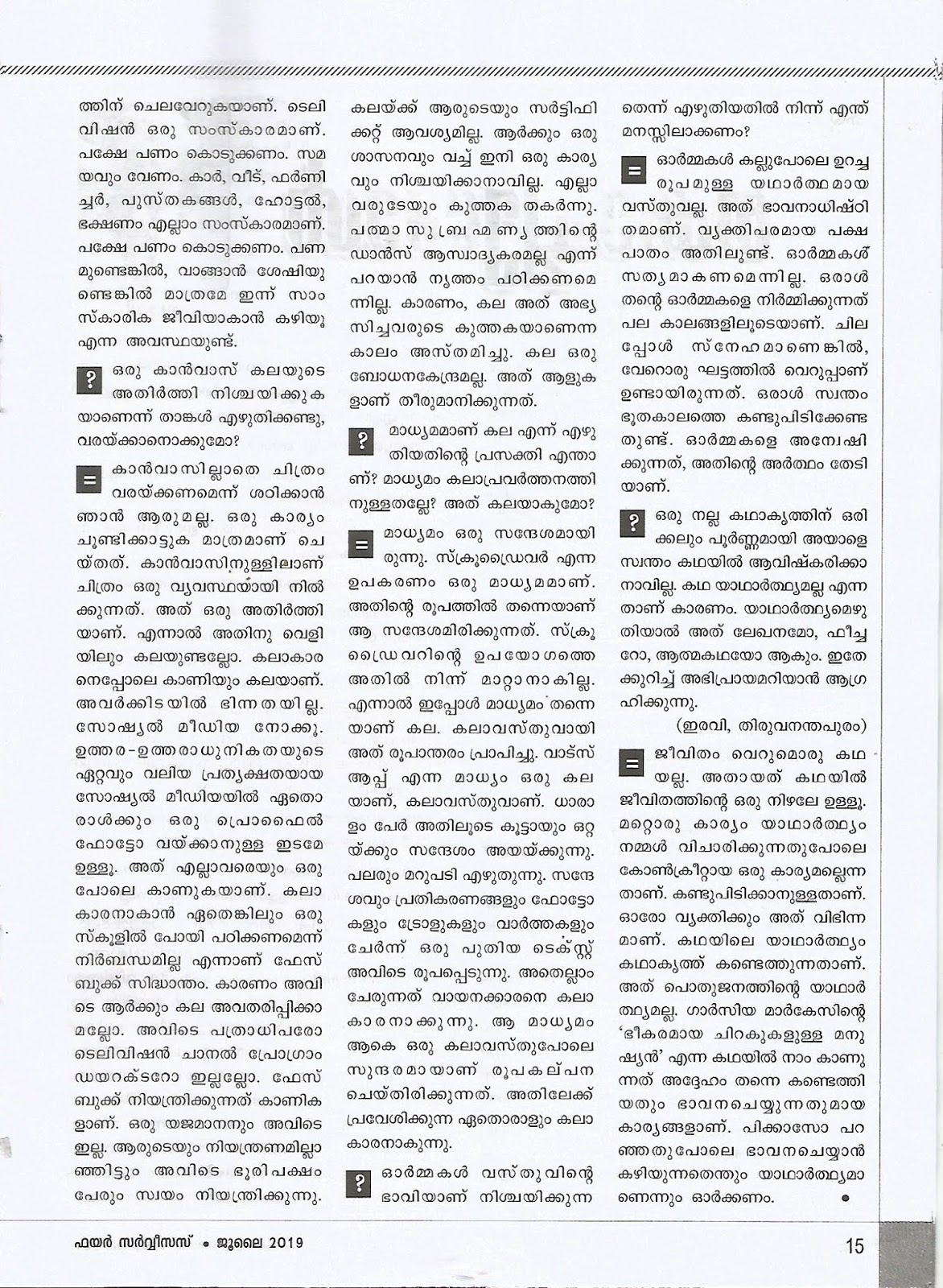നൃത്തം ചെയ്യുന്നവർക്ക് മനോധർമ്മം പ്രകടിപ്പിക്കാമെങ്കിലും, സ്വാതന്ത്ര്യമില്ല. അവർ ഒരു താളത്തിന്റെ ആവർത്തനത്തെ ശരീരത്തിൽനിന്ന് വിട്ടുപോകാതെ സൂക്ഷിക്കാൻ ബാധ്യസ്ഥരാണ്. സി.ജെ. തോമസിന്റെ ‘ഇവൻ എന്റെ പുത്രൻ’ എന്ന പുസ്തകത്തിന്റെ പുതിയ പതിപ്പ് ഇപ്പോൾ വായിച്ചതേയുള്ളൂ. സി.ജെയ്ക്ക് ആദരവ് അർപ്പിച്ചുകൊണ്ട് തയ്യാറാക്കിയ ഗ്രന്ഥമാണിത്. (പ്രസാ: മാളുബൻ) ലേഖനങ്ങളിൽ പരാമർശിച്ചു പോകുന്ന പാശ്ചാത്യനാമങ്ങളുടെ വിശദീകരണം പുസ്തകത്തിന്റെ ഒടുവിൽ ചേർത്തത് അതിനു തെളിവാണ്.