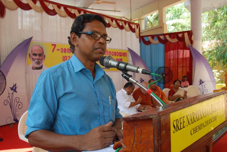 ചെമ്പഴന്തി ഗുരുകുല വാർഷിക കൺ വെൻഷനിൽ എം കെ ഹരികുമാർ പ്രസംഗിക്കുന്നു.സൂക്ഷ്മാനന്ദ സ്വാമി, ശുഭാംഗാനന്ദ സ്വാമി, പ്രൊഫ. സുശീല, എന്നിവർ സമീപം/april 30, 2016