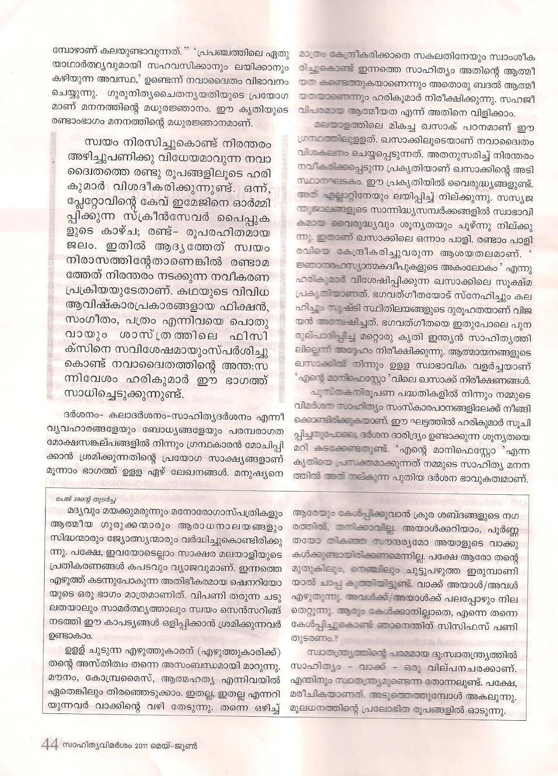 ഹരിയുടെ ചിന്തകളും അവയുടെ വ്യന്യാസരീതിയും മൗലികമായിരിക്കുന്നു എന്നു പറഞ്ഞാൽ അത് മൗലികവാദപരമാകുമോ എന്നു പേടിക്കുന്നു. വാക്കും ആത്മാവും ബദ്ധവൈരികളാകുന്ന ഈ വാണിജ്യവൽകൃതകാലത്തിൽ, തന്റെ കൃതിയെ മനസ്സൊഴിഞ്ഞുപോയ വാക്കുകളുടെ മാംസപ്രദർശനമാകാതെ നോക്കാൻ ഹരികുമാറിനു കഴിഞ്ഞിട്ടുണ്ട്.