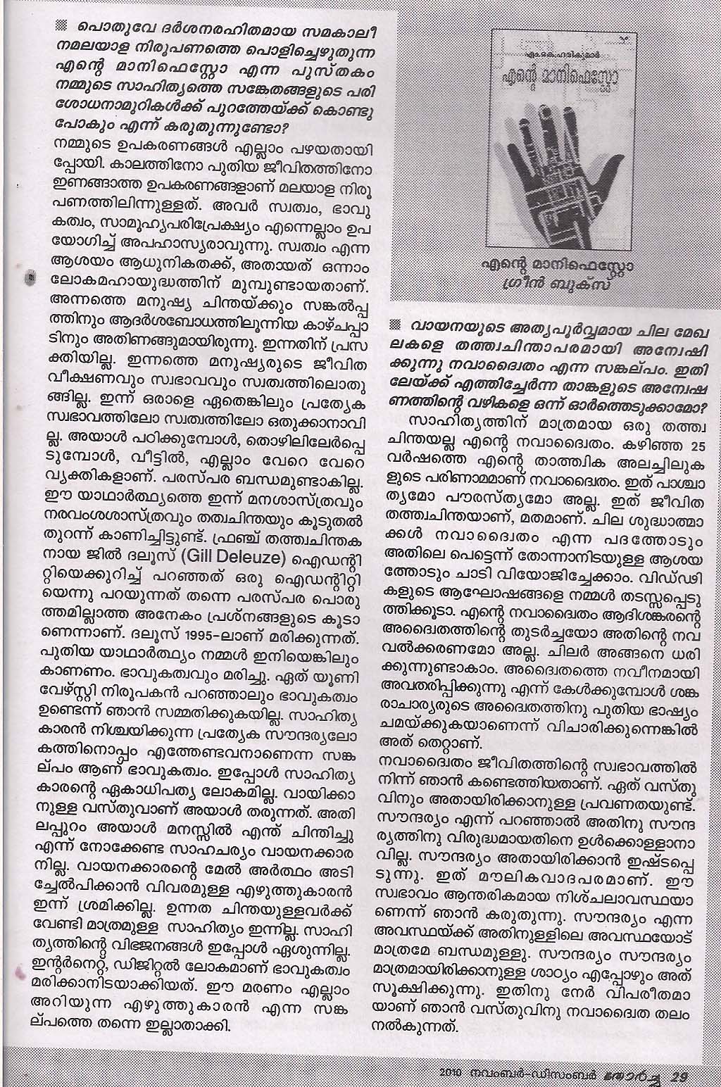ക്ഷമിക്കണം. പുസ്തകം-‘എന്റെ മാനിഫെസ്റ്റോ’- മനോഹരം.അടുത്ത കാലത്തൊന്നും ഇത്തരം ഒരു ചിന്താപ്രകാശം മനസ്സിലേക്കു കടന്നുവന്നതായി ഓർമ്മയില്ല. എന്നാലിന്നലെ വായിച്ചത് ഇന്നോർമ്മയില്ലാത്തതാണ് എന്റെ മുഖ്യവ്യസനം. അതിനാൽ ശ്രീ അച്ച്യുതനുണ്ണി മാസ്റ്ററുടെ ഒരു കഷണം വാചകം ഉദ്ധരിക്കുന്നു: ക്ഷമിക്കണം.“നിരന്തരം പുതിയ അർത്ഥങ്ങൾ അന്വേഷിച്ച് അനന്തതയിലേക്ക് യാത്ര ചെയ്യാൻ ഈ പുസ്തകം പ്രേരിപ്പിക്കുന്നു”