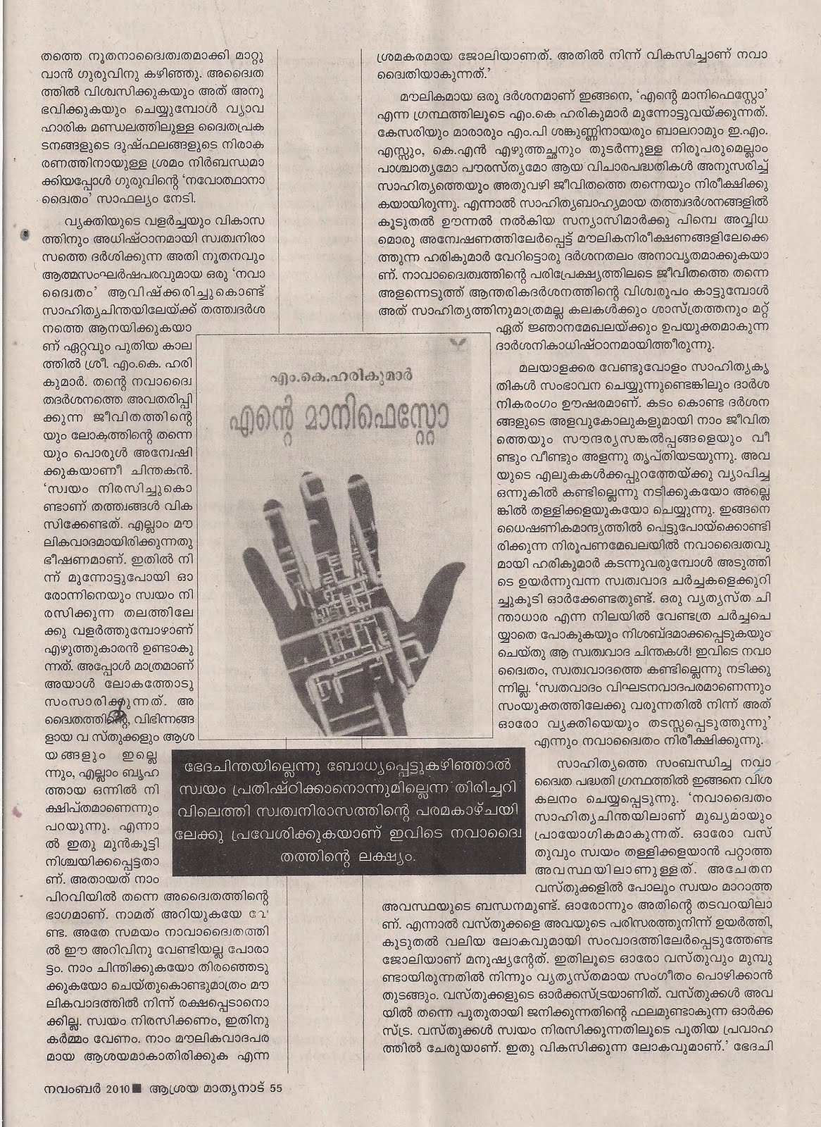 Adding one more feather to his cap is the very recent publication of his latest book, “Ente Manifesto”, means:My Manifesto. Well I am not the right person to make an opinion of what exactly the work reflects about Harikumar’s insight into the human nature and his irresistable temptation to express himself in words. But one thing I know: his latest book My Manifesto is the ultimate word in Malayalam literary criticism. It is the living example of critical analaysis of any critic who think they are the ones who decide what is best and what is not in Malayalam literature.